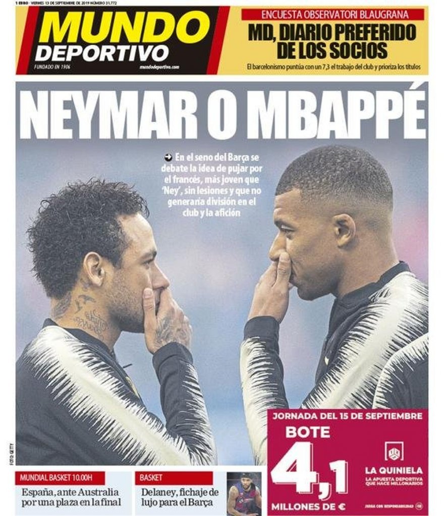 O Barcelona negociou com o PSG a compra do atacante Neymar. Porém, fala-se que o clube espanhol não fez todo o esforço necessário para selar a contratação do brasileiro. Agora, o jornal espanhol "El Mundo Deportivo", estampa na sua capa desta sexta-feira (13), a informação que a ideia de investir no francês Mbappé tem ganhado força entre os catalães.