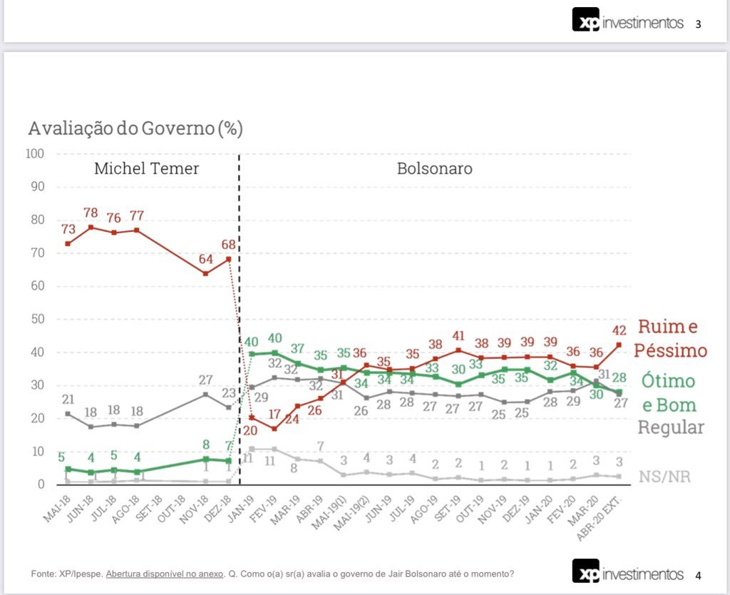 Uma pesquisa da XP Investimentos divulgada nesta sexta-feira (3) indica que a popularidade do presidente Jair Bolsonaro caiu em meio à crise do coronavírus. Segundo os números, 42% consideram o governo "ruim e péssimo". Essa condição se encontrava em 36% em pesquisa divulgada em março.