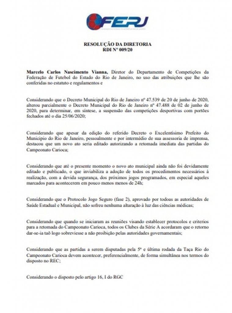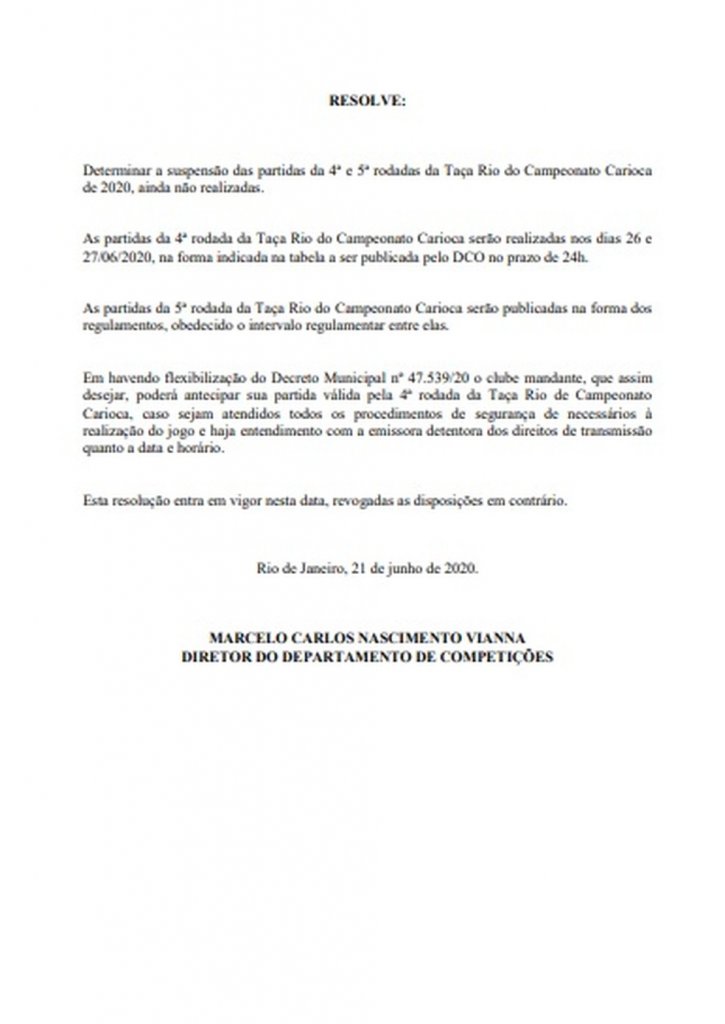 A Federação de Futebol do Estado do Rio (Ferj) emitiu uma resolução neste domingo (21) adiando a quarta e quinta rodadas da Taça Rio, do Campeonato Carioca. A medida foi assinada pelo diretor do Departamento de Competições da entidade, Marcelo Vianna. Os jogos da quarta rodada serão realizados na sexta-feira (26) e sábado (27). Enquanto as partidas da quinta jornada ainda serão definidos obedecendo o período de intervalo entre elas.