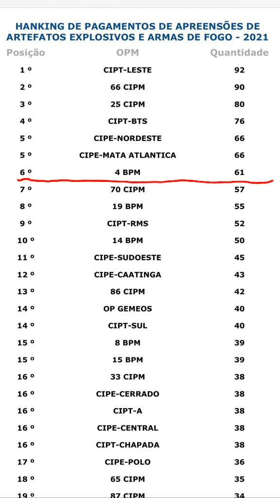 O Quarto Batalhão ocupa, com mérito, posição de destaque no ranking estadual de apreensão de armas de fogo e artefatos explosivos na Bahia, estando no sexto lugar, dentre todas as unidades da PMBA, com 61 (sessenta e uma) apreensões, ao longo do ano 2021.