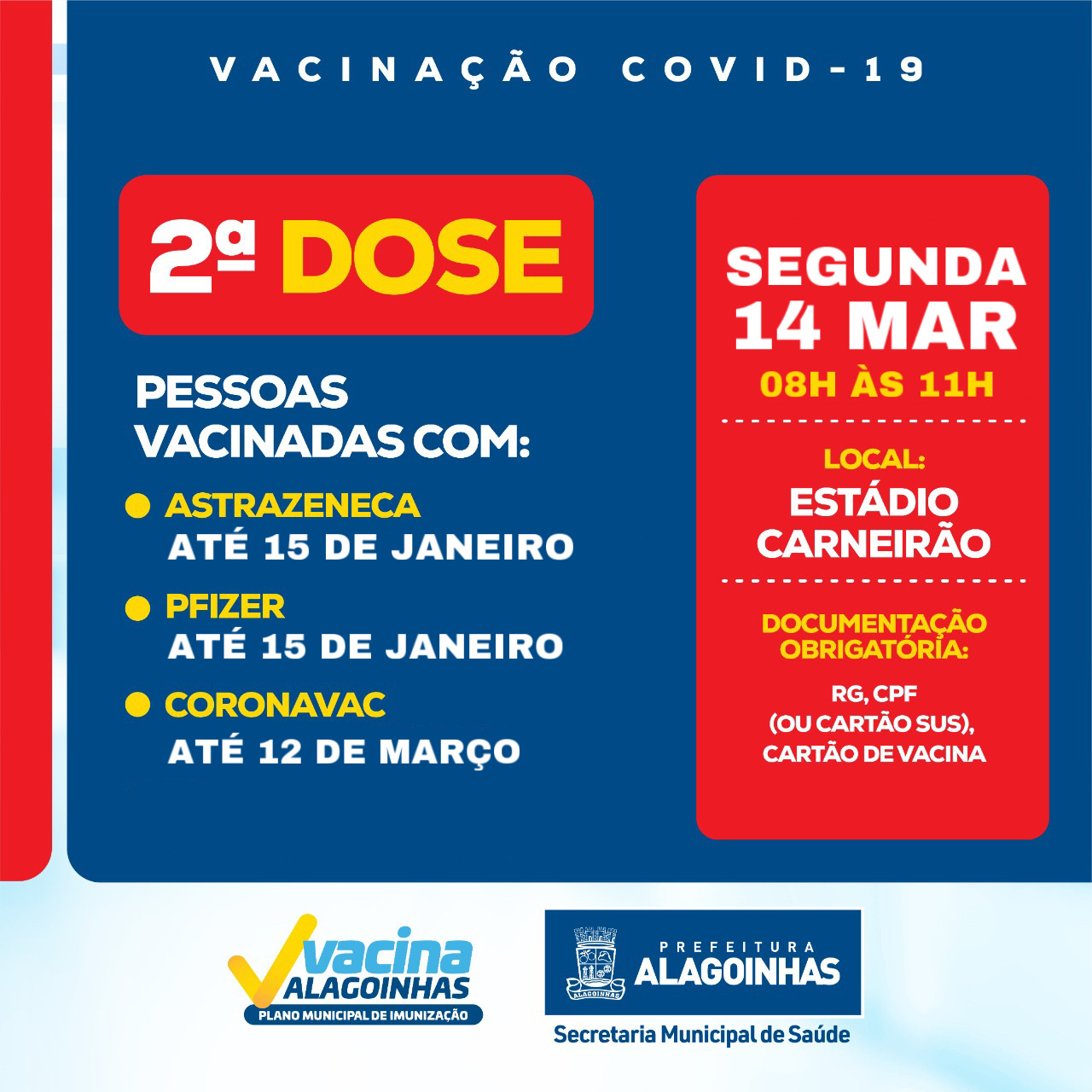 A vacinação acontece no estádio Carneirão, das 8h às 11h, exclusivamente com a segunda dose para pessoas vacinadas com a primeira dose da AstraZeneca e Pfizer até 15 de janeiro e com Coronavac até 12 de março.