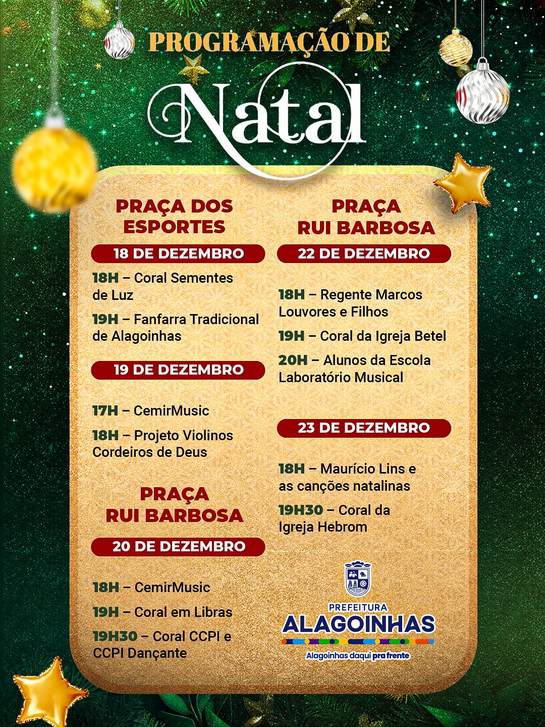 A Prefeitura de Alagoinhas, por meio da Secretaria Municipal de Cultura, Esporte e Turismo (Secet), segue com a programação especial para celebrar o Natal com apresentações culturais abertas ao público. Do dia 18 de dezembro até o dia 23, haverá atrações musicais e corais em diferentes pontos da cidade, valorizando artistas, projetos sociais e grupos locais.